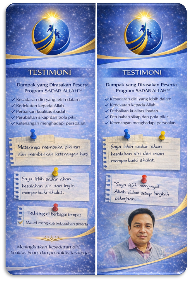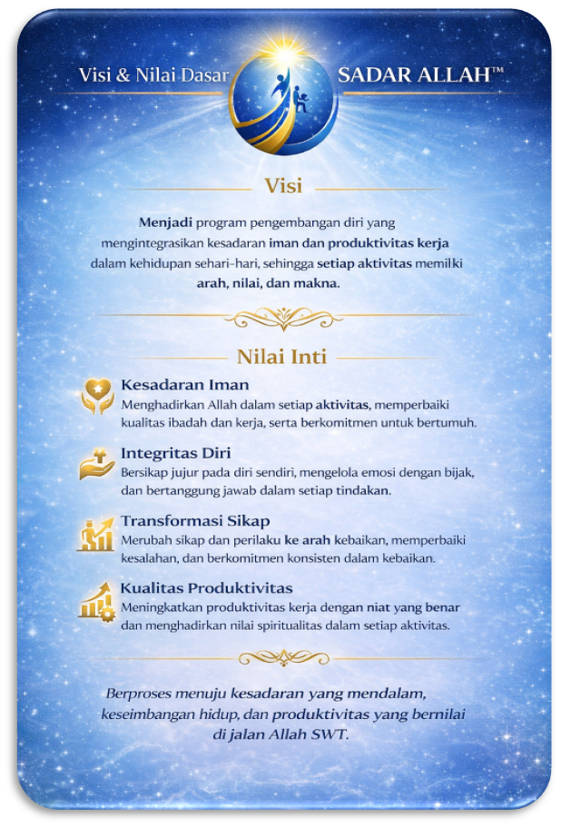 Produktif dalam Kerja dan Iman. SADAR ALLAH adalah program pengembangan diri berbasis kesadaran spiritual yang dirancang untuk mengintegrasikan iman dengan aktivitas kerja dan kehidupan sehari-hari.
