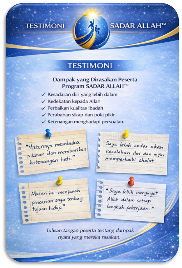SADAR ALLAH hadir untuk membantu peserta menyelaraskan iman dan aktivitas, sehingga menghasilkan ketenangan hati, kejernihan berpikir, dan produktivitas kerja.